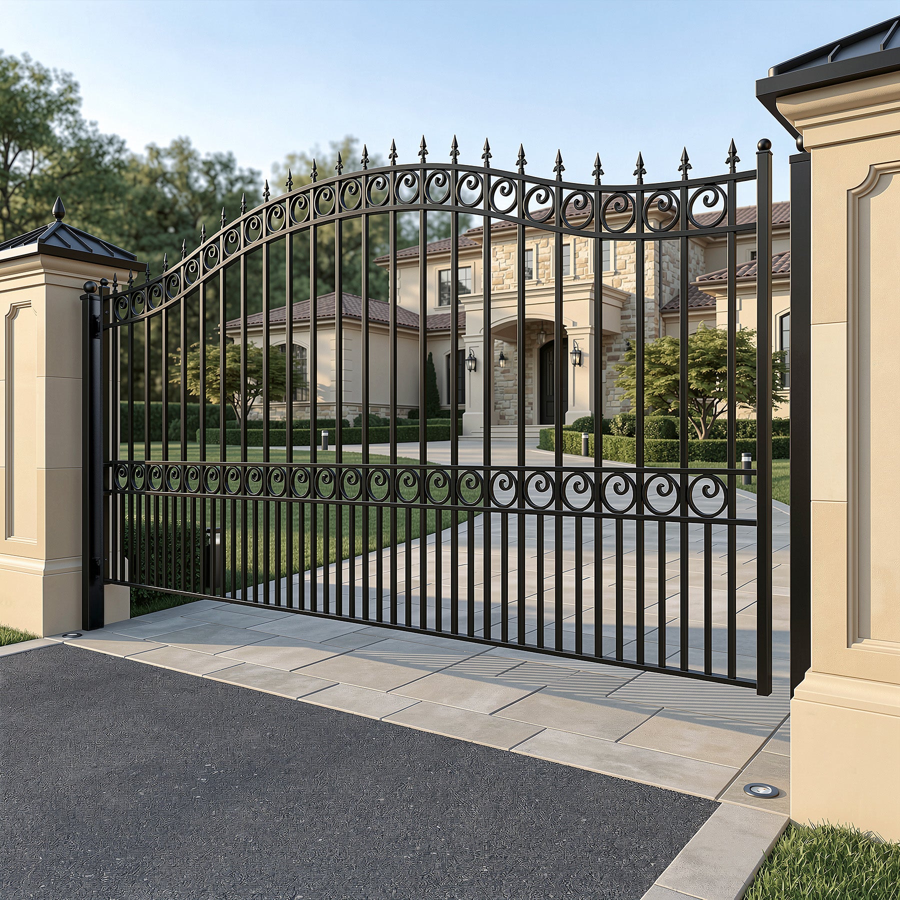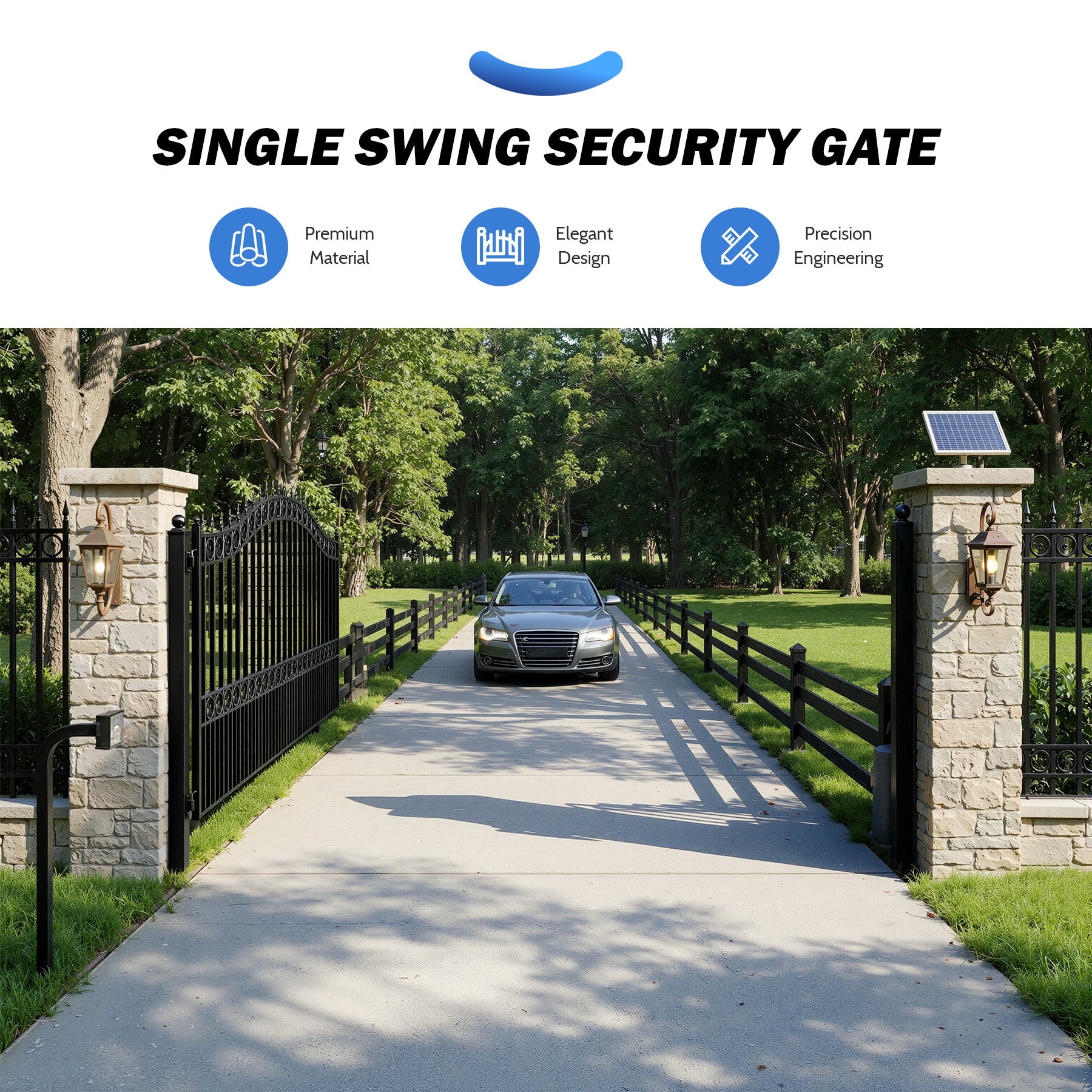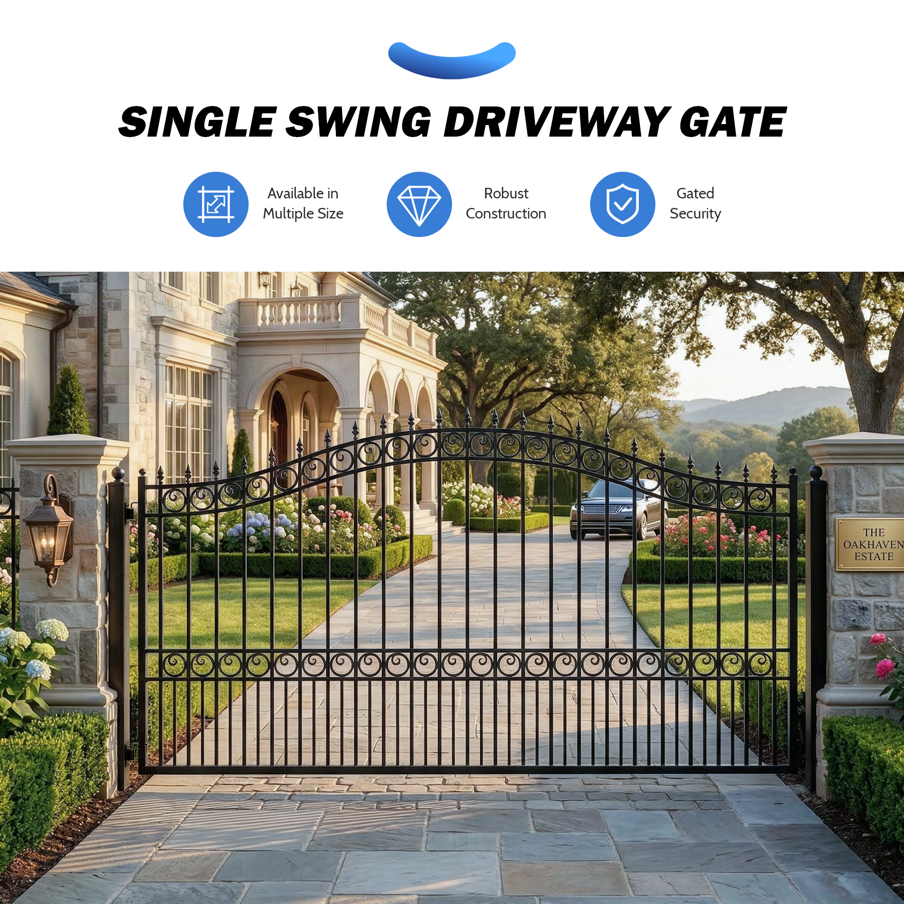 Elegant Protection for Your Home: ZUMI's single swing driveway gate helps keep your family and property safe. The classic arched top and intricate scrollwork add timeless elegance to your home's entrance