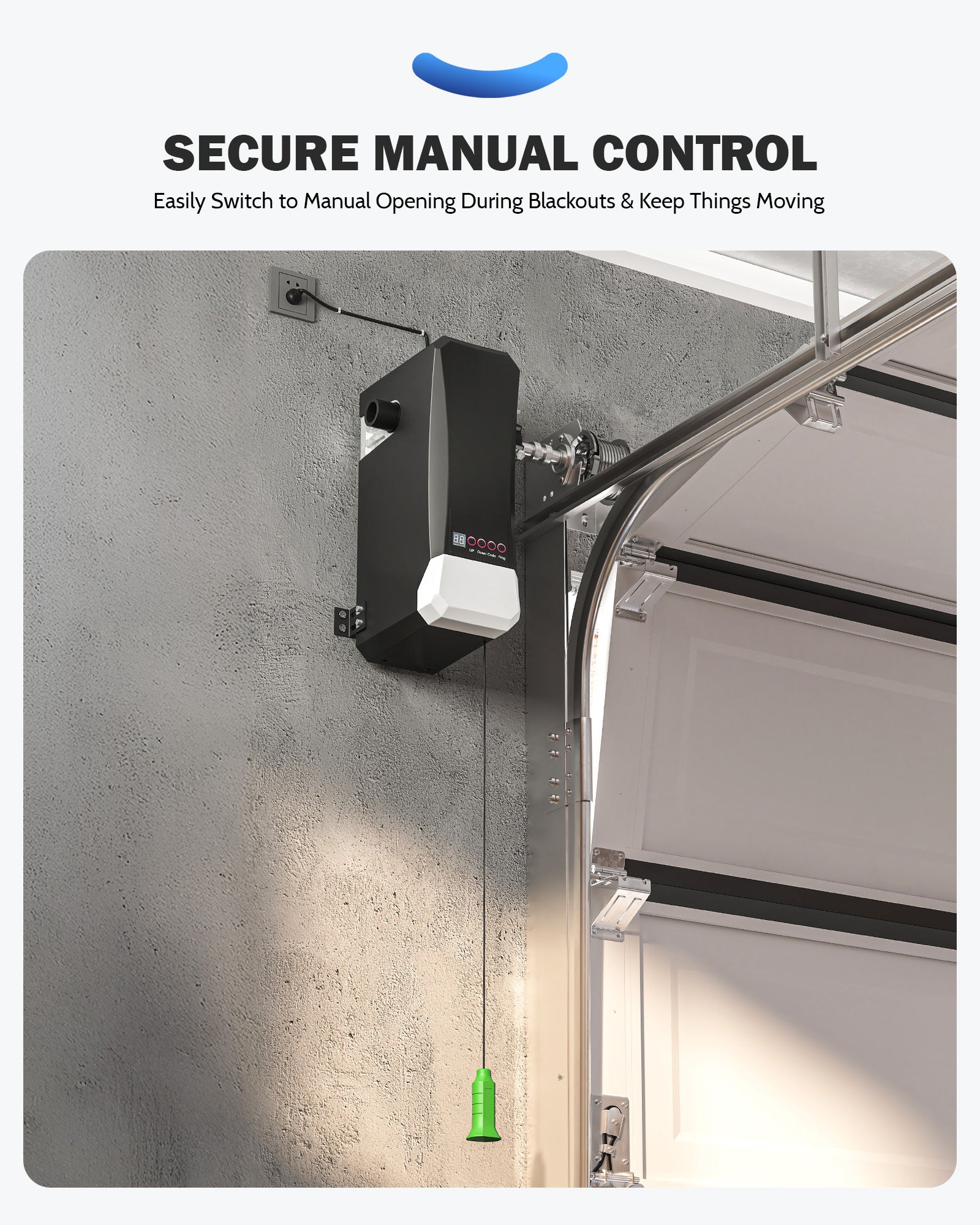 Secure Manual Backup: Pull the built-in handle to quickly unlock the opener and switch to manual mode. It's a simple way to stay in control even during unexpected power failures or emergencies